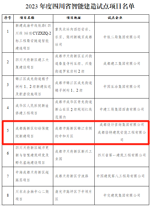 近日,四川省住房和城鄉建設廳公布了四川省(第一批)13個智能建造試點項目,成都設計咨詢集團·市建筑院承接的成都高新婦幼保健院新建項目成功入選。此前,該項目已入選成都市首批智能建造試點項目,而在本次入選的智能建造試點企業中,集團也是唯一的設計咨詢企業。
