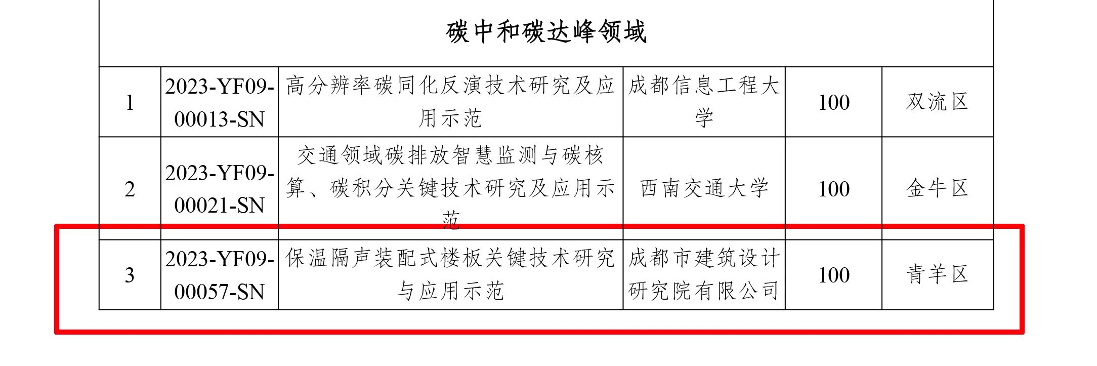 近日,成都設計咨詢集團·市建筑院建筑工業化設計研究中心《保溫隔聲裝配式樓板關鍵技術研究與應用示范》項目入選2023年成都市第三批重點研發項目,經公示期滿成功立項,將獲得100萬元資助金額。本次公示的擬立項項目為四個領域共計26個項目,市建筑院入選項目為碳達峰碳中和領域成果轉化示范項目。