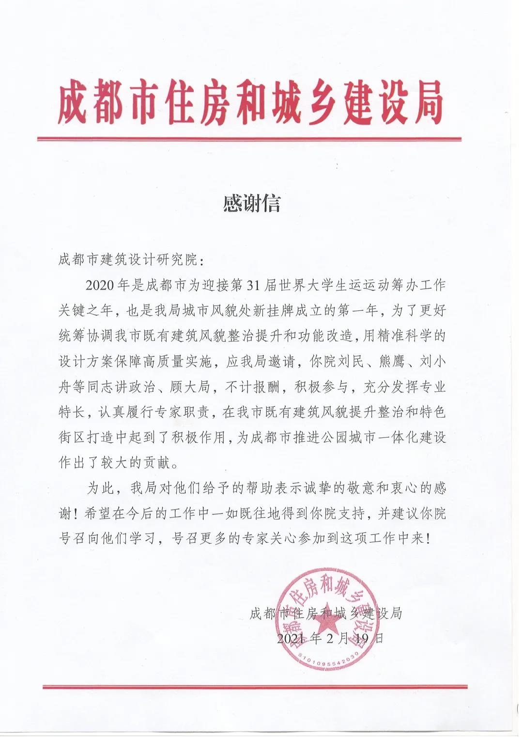 ??? 近日,成都(dou)(dou)市(shi)住(zhu)房和城鄉建設局向CDAD發來(lai)感(gan)謝信,對CDAD在成都(dou)(dou)市(shi)既有建筑風貌提升整(zheng)治和特色街區打造中起到的積極作用與為成都(dou)(dou)市(shi)迎接第31屆世界大(da)學生運動(dong)會(hui)、推進公園城市(shi)一體化(hua)建設作出的貢獻給予肯(ken)定和感(gan)謝;對CDAD總(zong)建筑師劉民(min)、所總(zong)建筑師熊鷹、顧(gu)問(wen)總(zong)建筑師劉小舟等同志講政治、顧(gu)大(da)局、不計報酬,積極參(can)與,充分發揮專業特長(chang),認真(zhen)履(lv)行專家職責(ze)給予高度贊揚。