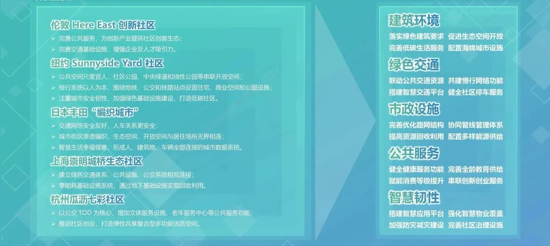 《導則》重點突出街道空(kong)間一(yi)體化、綠(lv)色建(jian)筑(zhu)、軌道交通站(zhan)城(cheng)一(yi)體、綠(lv)色能源供(gong)能系統等建(jian)設(she)(she)指標(biao)(biao),推動(dong)城(cheng)市空(kong)間結(jie)(jie)(jie)構、產業(ye)結(jie)(jie)(jie)構、交通結(jie)(jie)(jie)構、能源結(jie)(jie)(jie)構調(diao)整(zheng)。綠(lv)色建(jian)筑(zhu)、裝配式建(jian)筑(zhu)、新能源停車位、多級(ji)社(she)區(qu)海綿(mian)設(she)(she)施等建(jian)設(she)(she)指標(biao)(biao)已(yi)納(na)入新出讓地塊建(jian)設(she)(she)條件,相關(guan)約(yue)束(shu)性內容已(yi)納(na)入建(jian)設(she)(she)項目施工(gong)圖審查范圍,規范指引未來公園社(she)區(qu)項目設(she)(she)計和建(jian)設(she)(she)。