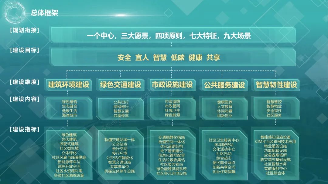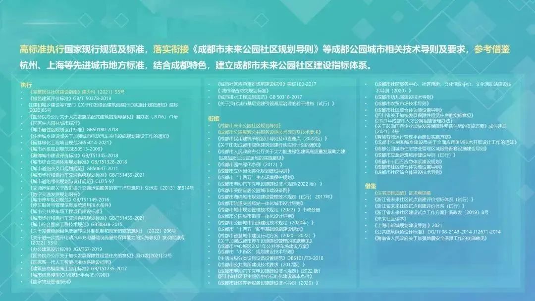 《導則》根據成(cheng)(cheng)都市未來公(gong)園社(she)區(qu)“一(yi)個中心、三(san)大(da)愿景(jing)、四項原則、七大(da)特(te)征、九(jiu)大(da)場景(jing)”總體思路,研究(jiu)借鑒住房城鄉建設部(bu)(bu)完整(zheng)社(she)區(qu)、自然資源部(bu)(bu)社(she)區(qu)生活圈(quan)、國家發改委低(di)碳社(she)區(qu)、浙江未來社(she)區(qu)等標準(zhun)體系,鏈接成(cheng)(cheng)都公(gong)園城市相關技術(shu)導則及(ji)要求,圍(wei)繞“安全(quan)、宜人、智(zhi)慧、低(di)碳、健康、共享(xiang)”6大(da)目標,構建形成(cheng)(cheng)極具成(cheng)(cheng)都公(gong)園城市特(te)色的(de)“5+20+44”指標體系。