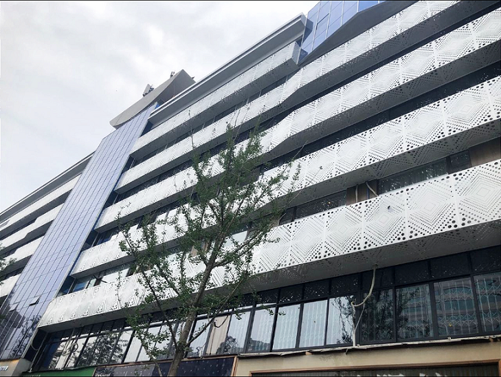 華立大廈通(tong)過(guo)肌理細膩的(de)沖孔鋁板(ban)造型遮蔽外(wai)墻(qiang)雜亂的(de)空調(diao)室外(wai)機等附屬物,將(jiang)材質低端的(de)藍色玻璃窗(chuang)更(geng)(geng)換為(wei)隔音節能(neng)性(xing)能(neng)更(geng)(geng)好的(de)斷橋中空玻璃窗(chuang),優化(hua)建筑(zhu)整(zheng)體形的(de)同時完成既(ji)有(you)建筑(zhu)的(de)使用功能(neng)提升。